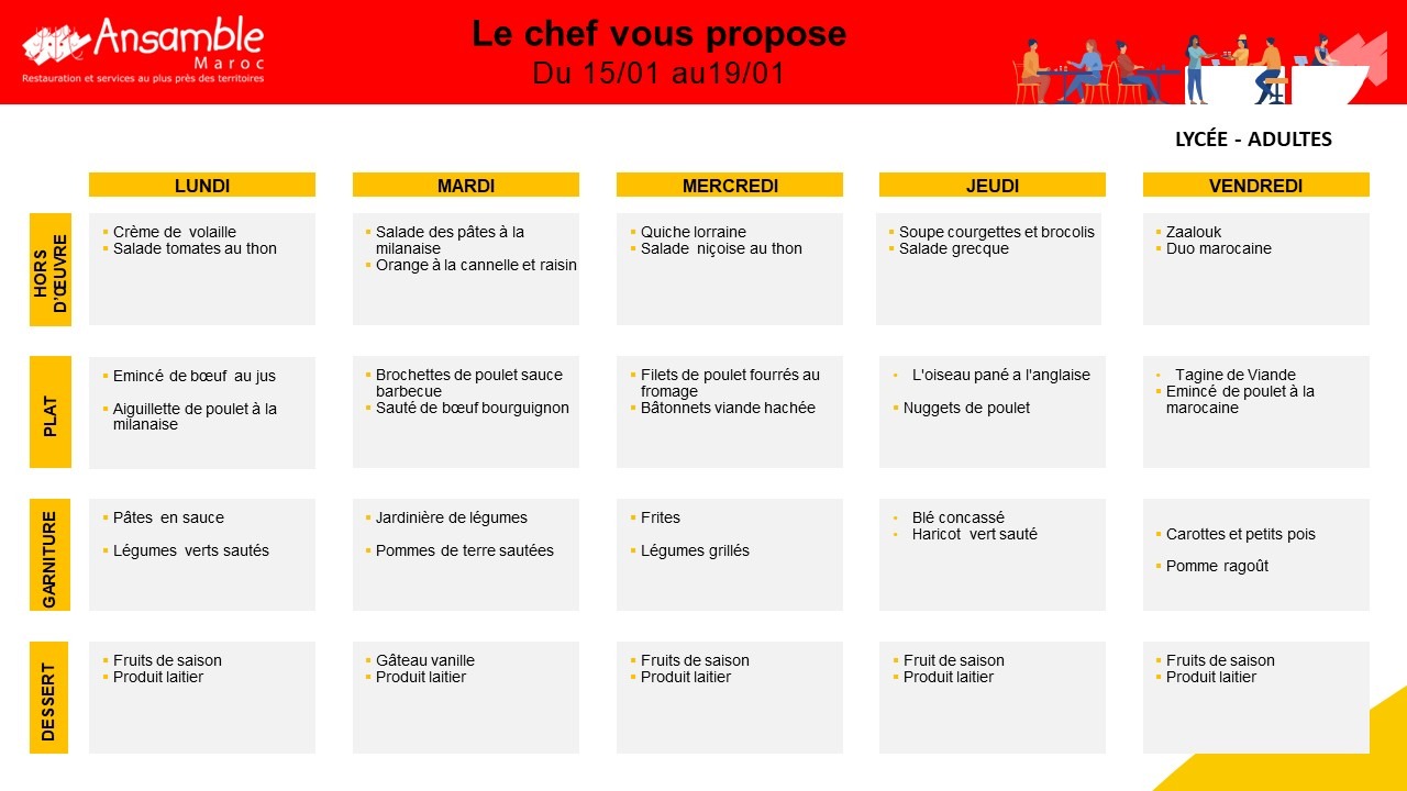 Published in: Acualités Menu de la cantine du mois de Janvier / collège -lycée -adultes Author Mohamed El Koudesi Published on: 29 février 2024
