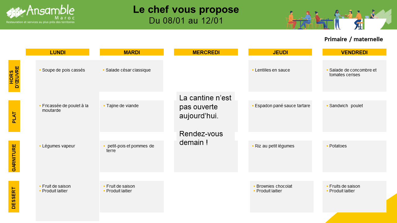 Published in: Acualités Menu de la cantine du mois de Janvier /Maternelle -Primaire Author Mohamed El Koudesi Published on: 29 février 2024